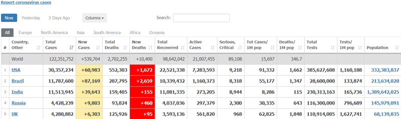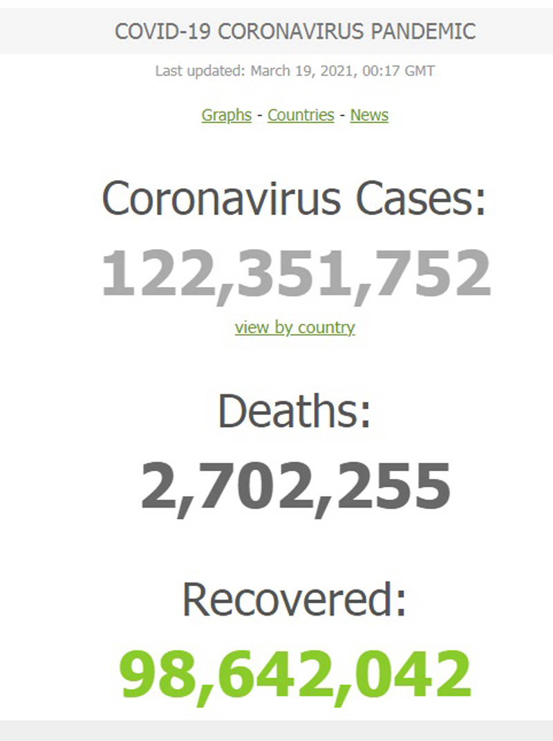 พบผู้ติดเชื้อทั่วโลกแล้ว 122,351,752 ราย เพิ่มขึ้น 539,764 ราย เสียชีวิต 2,702,255 ราย เพิ่มขึ้น 10,400 ราย รักษาหาย 98,642,042 ราย