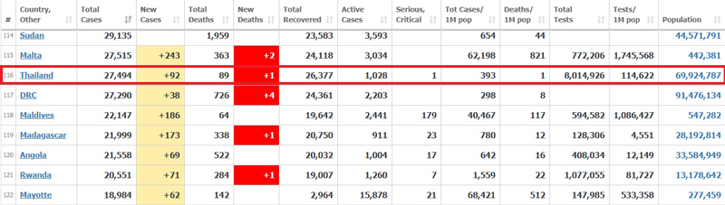 ส่วนประเทศไทย อยู่ในอันดับที่ 116 ขยับลง 1 อันดับ จากเดิมที่อันดับ 115 มีผู้ติดเชื้อ 27,494 ราย เพิ่มขึ้น 92 ราย เสียชีวิต 89 ราย เพิ่มขึ้น 1 ราย รักษาหาย 26,377 ราย
