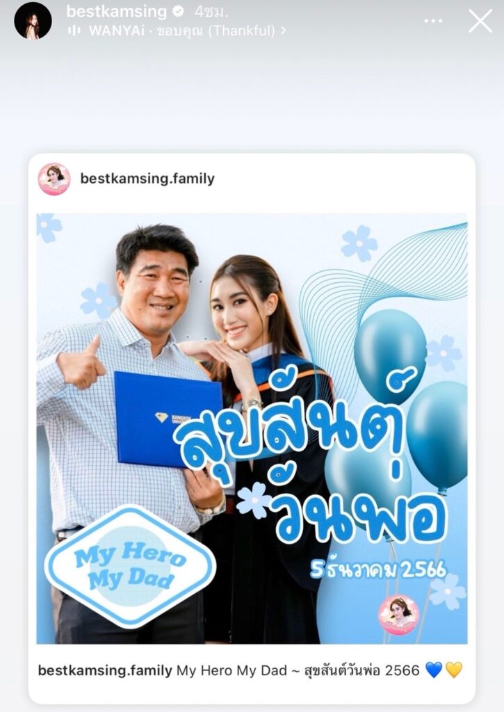 ต่อกันที่ยูทูบเบอร์สาวดีกรีนักแสดง”เบสท์ รักษ์วนีย์”ที่เจ้าตัวออกมาแชร์สตอรี่เป็นรูปตัวเองสวมชุดครุยรับปริญญาคู่คุณพ่อ”สมรักษ์” ที่เขียนข้อความว่า”สุขสันต์วันพ่อ”