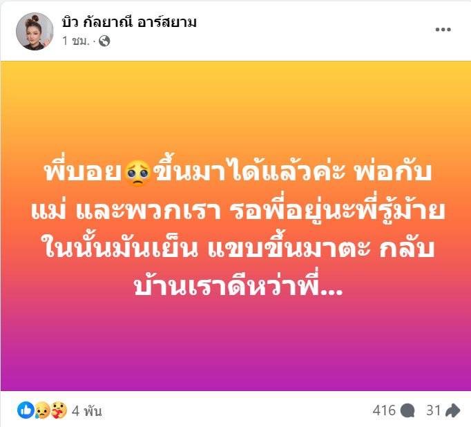 ล่าสุดทางด้าน “บิว กัลยานี” ได้ออกมาโพสต์เฟซบุ๊กสุดเศร้าว่า “พี่บอย🥺ขึ้นมาได้แล้วค่ะ พ่อกับแม่ และพวกเรา รอพี่อยู่นะพี่รู้ม้าย ในนั้นมันเย็น แขบขึ้นมาตะ กลับบ้านเราดีหว่าพี่…”ท่ามกลางชาวเน็ตเข้ามาส่งกำลังใจให้สาว”บิว”อยู่กันอย่างล้นหลาม