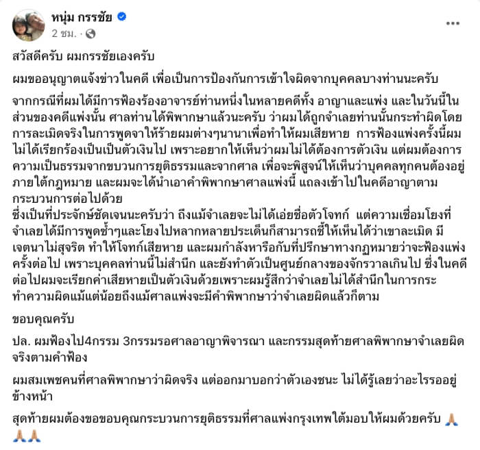 จากกรณีที่พิธีกรและผู้ประกาศข่าวชื่อดัง หนุ่ม กรรชัย แจ้งความอาจารย์รายหนึ่ง ไว้หลายคดีทั้งอาญาและแพ่ง ล่าสุดวันนี้ (7 ธ.ค.) หนุ่ม กรรชัย ได้ออกมาโพสต์ข้อความลงในเฟซบุ๊กส่วนตัว เพื่ออัปเดตคดีอาจารย์ดังที่กำลังฟ้องร้องกันอยู่ โดยระบุว่่า