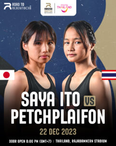 คู่ที่ 1 ซายะ อิโตะ ดีกรีแชมป์มินิฟลายเวต WBC และ WMC และแชมป์สหพันธ์มวยไทยอาชีพโลก (WPMF) 3 สมัย ชาวญี่ปุ่น จะพบกับ เพชรปลายฝน ศิษย์มิ้งค์
