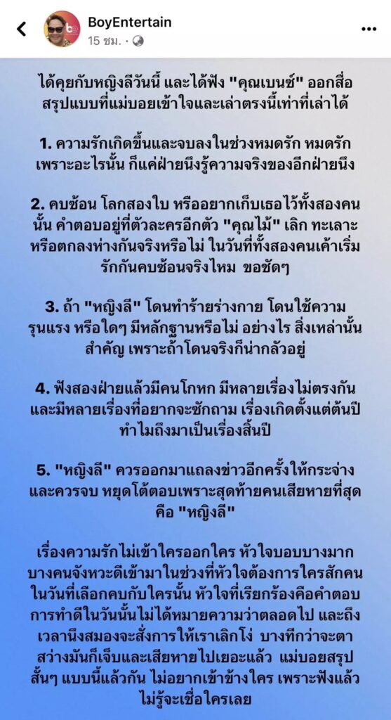 ล่าสุดทางด้านเฟซบุ๊ก BoyEntertain นักข่าวชื่อดัง ได้ออกมาโพสต์ข้อความสรุปเรื่องราวดราม่าดังกล่าวโดยได้โพตส์ร่ายยาวว่า “ได้คุยกับหญิงลีวันนี้ และได้ฟัง คุณเบนซ์ออกสื่อ สรุปแบบที่แม่บอยเข้าใจและเล่าตรงนี้เท่าที่เล่าได้