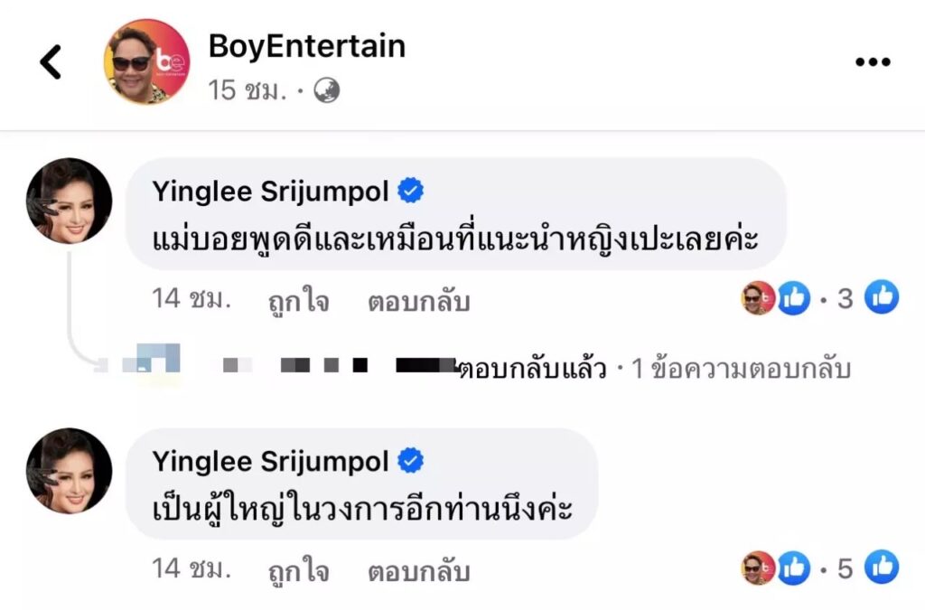 ซึ่งต่อมา”หญิงลี” ก็ได้เข้ามาคอมเมนต์ทันทีว่า “เป็นผู้ใหญ่ในวงการอีกท่านนึงค่ะ, แม่บอยพูดดีและเหมือนที่แนะนำหญิงเป๊ะเลยค่ะ”