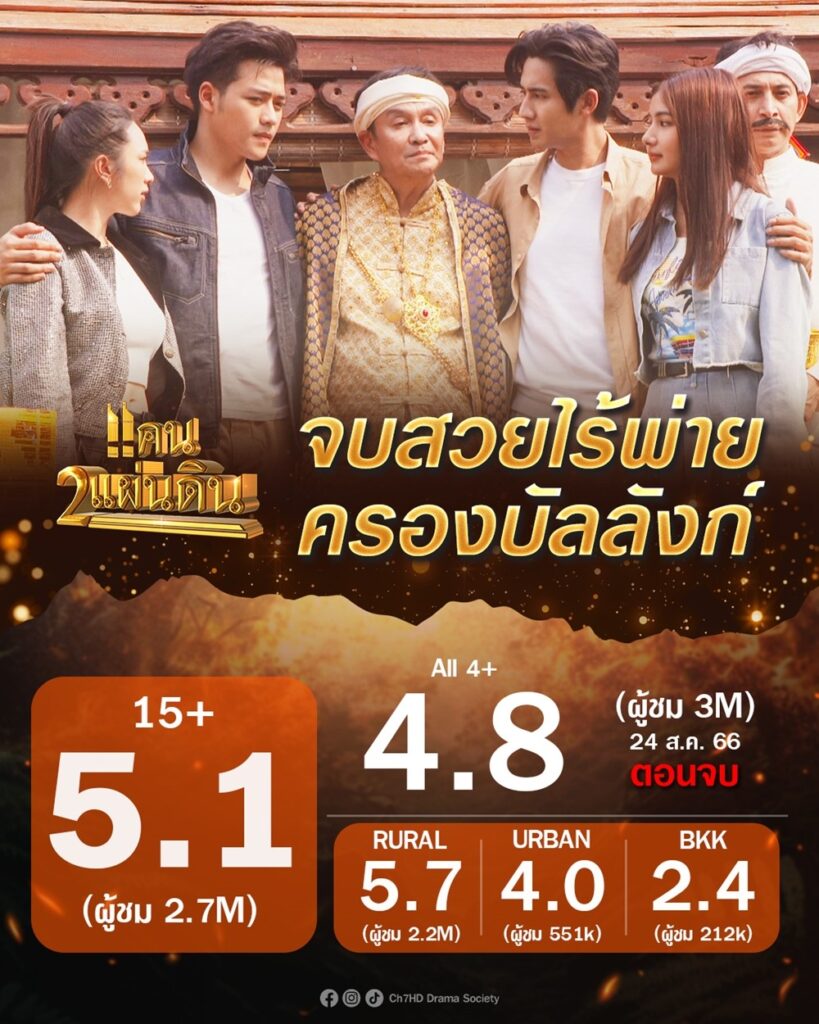 ส่วนละครแอ็กชั่นสุดมัน ที่มีเรตติ้งแรงต่อเนื่อง เรื่อง แคน2แผ่นดิน นำแสดงโดย โอ๊ต-ชาคริต และ ริส-วิชญพงศ์ ประกบ 2 นางเอก มะเหมี่ยว-พรชดา และ พลอย-รัญดภา จากฝีมือผู้กำกับระดับตำนาน และศิลปินแห่งชาติ ฉลอง ภักดีวิจิตร นอกจากจะได้เรตติ้งตอนจบสวยงาม 15+ ทั่วประเทศ 5.1 ยังทำสถิติเป็นละครเรื่องที่ 2 ของปีที่ได้เรตติ้งเฉลี่ยสูงสุดของปี ด้วยเรตติ้งเฉลี่ย 4.3 เช่นเดียวกับ เพลิงไพร