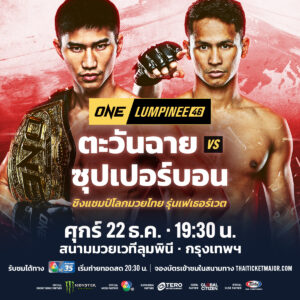 ติดตาม “ตะวันฉาย vs ซุปเปอร์บอน” ในศึก ONE ลุมพินี 46 ศุกร์ที่ 22 ธ.ค.นี้ ถ่ายทอดสดจากสนามมวยเวทีลุมพินี (รามอินทรา) รับชมทางช่อง 7HD กด 35 รับสัญญาณเวลา 20.30 น. ส่วนทางเฟซบุ๊ก ONE Championship Thailand และยูทูบ ONE Championship (บางประเทศ) รับชมได้เฉพาะคู่ 1-6 เริ่มคู่แรกเวลา 19.30 น.