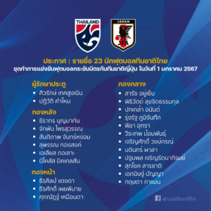 สมาคมกีฬาฟุตบอลแห่งประเทศไทย ในพระบรมราชูปถัมภ์ ประกาศรายชื่อ 23 นักกีฬาฟุตบอลทีมชาติไทย ชุดทำการแข่งขันฟุตบอลกระชับมิตรกับทีมชาติญี่ปุ่น ในวันที่ 1 มกราคม 2567