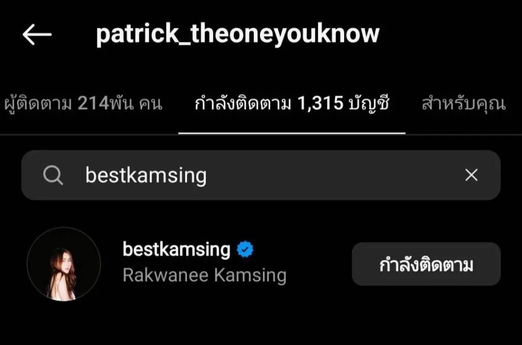 แต่เอ๊ะ! ดูเหมือนเรือไม่พายแล้วสิจ๊ะ เมื่อเข้าไปส่องในช่องทางทางโซเชียลของ “เบสท์”พบว่า ได้กดอัลฟอลโล่”แพทริค”และมีการซ่อนภาพคู่ อีกทั้งในติ๊กต็อกด้าน “เบสท์”ก็ได้ซ่อนภาพคู่ที่ถ่ายร่วมเฟรมกับ แก้มบุ๋ม-พีท ในงานแต่ง เมย์ พิชญ์นาฏ ด้วยเช่นเดียวกัน แต่ทางด้าน “แพทริค”ยังคงฟอลโล่”เบสท์”เหมือนเดิม
