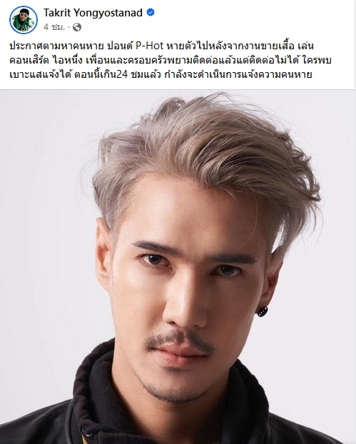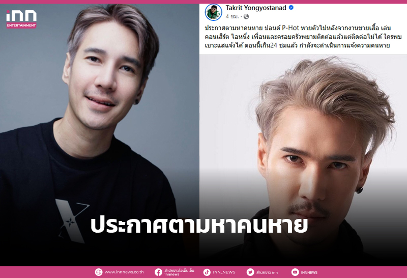 ล่าสุด คนสนิทที่ใช้ชื่อเฟซบุ๊กว่า Takrit Yongyostanad ได้ออกมาโพสต์ประกาศตามหาระบุข้อความว่า ประกาศตามหาคนหาย ปอนด์ P-Hot หายตัวไปหลังจากงานปาร์ตี้ ไอหนึ่ง เพื่อนและครอบครัวพยามติดต่อแล้วแต่ติดต่อไม่ได้ ใครพบเบาะแสแจ้งได้ ตอนนี้เกิน 24 ชม.แล้ว กำลังจะดำเนินการแจ้งความคนหาย