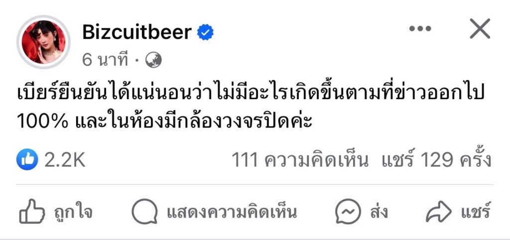 ต่อมาทางด้าน”เบียร์” ได้ออกมาเคลื่อนไหวโดยการแชร์โพสต์ว่า “บางครั้งมีคนพูดถึงเราไม่ดี พอมองย้อนไปดู คุณภาพชีวิตของคนที่พูดเลยไม่รู้สึกโกรธเลย” พร้อมแคปชั่น “อิโมจิรอยยิ้มสีเหลือง” และได้ออกมาโพสต์อีกครั้งปฎิเสธิกับเรื่องราวที่เกิดขึ้นว่า”เบียร์ยืนยันได้แน่นอนว่า ไม่มีอะไรเกิดขึ้นตามที่ข่าวออกไป100% และในห้องมีกล้องวงจรปิดคะ