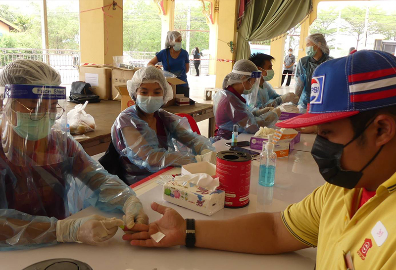 บรรยากาศตั้งแต่ช่วงเช้ามีประชาชนมาเข้าคิวเพื่อรับการตรวจคัดกรองด้วยการเจาะเลือดโดยใช้อุปกรณ์ชุดตรวจแรบบิทเทส ปัจจุบันสถิติการติดเชื้อภายในจังหวัดปทุมธานีมีผู้ป่วยสะสมจำนวน 672 ราย โดยรักษาหายแล้วจำนวน 534 ราย อยู่ระหว่างการรักษา จำนวน 137 ราย และมีผู้เสียชีวิต 1 ราย จึงมีความจำเป็นจะต้องมีการจัดทีมลงพื้นที่ตรวจในพื้นที่เพื่อสร้างความมั่นใจ และเป็นการป้องกันการแพร่ระบาดแบบเป็นกลุ่มก้อน ส่วนรถฉีดพ่นละอองฝอยฆ่าเชื้อโรค ได้ฉีดพ่นรอบบริเวณวัดและชุมชนที่อยู่อาศัยของประชาชน