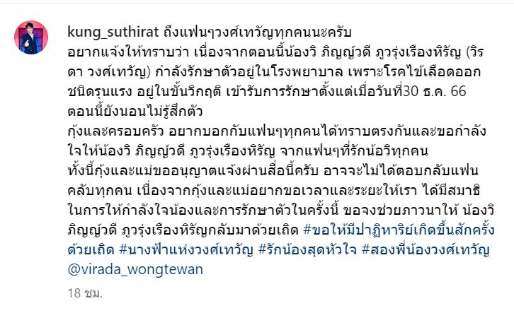 ถึงแฟนๆวงศ์เทวัญทุกคนนะครับ…อยากแจ้งให้ทราบว่า เนื่องจากตอนนี้น้องวิ ภิญญ์วดี ภูวรุ่งเรืองหิรัญ (วิรดา วงศ์เทวัญ) กำลังรักษาตัวอยู่ในโรงพยาบาล เพราะโรคไข้เลือดออกชนิดรุนแรง อยู่ในขั้นวิกฤติ เข้ารับการรักษาตั้งแต่เมื่อวันที่30 ธ.ค. 66 ตอนนี้ยังนอนไม่รู้สึกตัว