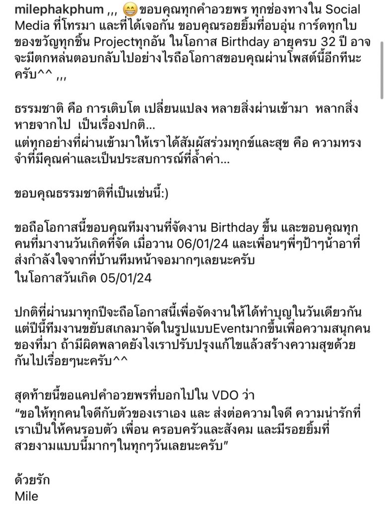“ธรรมชาติ คือ การเติบโต เปลี่ยนแปลง หลายสิ่งผ่านเข้ามา หลากสิ่งหายจากไป เป็นเรื่องปกติ…แต่ทุกอย่างที่ผ่านเข้ามาให้เราได้สัมผัสร่วมทุกข์และสุข คือ ความทรงจำที่มีคุณค่าและเป็นประสบการณ์ที่ล้ำค่า…ขอบคุณธรรมชาติที่เป็นเช่นนี้:) ขอถือโอกาสนี้ขอบคุณทีมงานที่จัดงาน Birthday ขึ้น และขอบคุณทุกคนที่มางานวันเกิดที่จัด เมื่อวาน 06/01/24 และเพื่อนๆ พี่ๆ ป้าๆ น้าอาที่ส่งกำลังใจจากที่บ้านทีมหน้าจอมากๆ เลยนะครับ ในโอกาสวันเกิด 05/01/24”