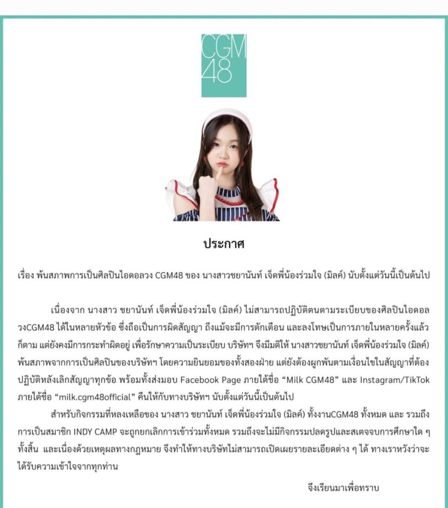 โดยประกาศว่า “ประกาศ เรื่อง พ้นสภาพการเป็นศิลปินไอดอลวง CGM48 ของ นางสาวชยานันท์ เจ็ดพี่น้องร่วมใจ (มิลค์) นับตั้งแต่วันนี้เป็นต้นไป เนื่องจาก นางสาว ชยานันท์ เจ็ดพี่น้องร่วมใจ (มิลค์) ไม่สามารถปฏิบัติตนตามระเบียบของศิลปินไอดอลวงCGM48 ได้ในหลายหัวข้อ ซึ่งถือเป็นการผิดสัญญา ถึงแม้จะมีการตักเตือน และลงโทษเป็นการภายในหลายครั้งแล้ว ก็ตาม แต่ยังคงมีการกระทำผิดอยู่ เพื่อรักษาความเป็นระเบียบ บริษัทฯ จึงมีมติให้ นางสาวชยานันท์ เจ็ดพี่น้องร่วมใจ (มิลค์)พ้นสภาพจากการเป็นศิลปินของบริษัทฯ โดยความยินยอมของทั้งสองฝ่าย แต่ยังต้องผูกพันตามเงื่อนไขในสัญญาที่ต้อง ปฏิบัติหลังเลิกสัญญาทุกข้อ พร้อมทั้งส่งมอบ Facebook Page ภายใต้ชื่อ “Milk CGM48” และ Instagram/TikTokภายใต้ชื่อ “milk.cgm48official” คืนให้กับทางบริษัทฯ นับตั้งแต่วันนี้เป็นต้นไป