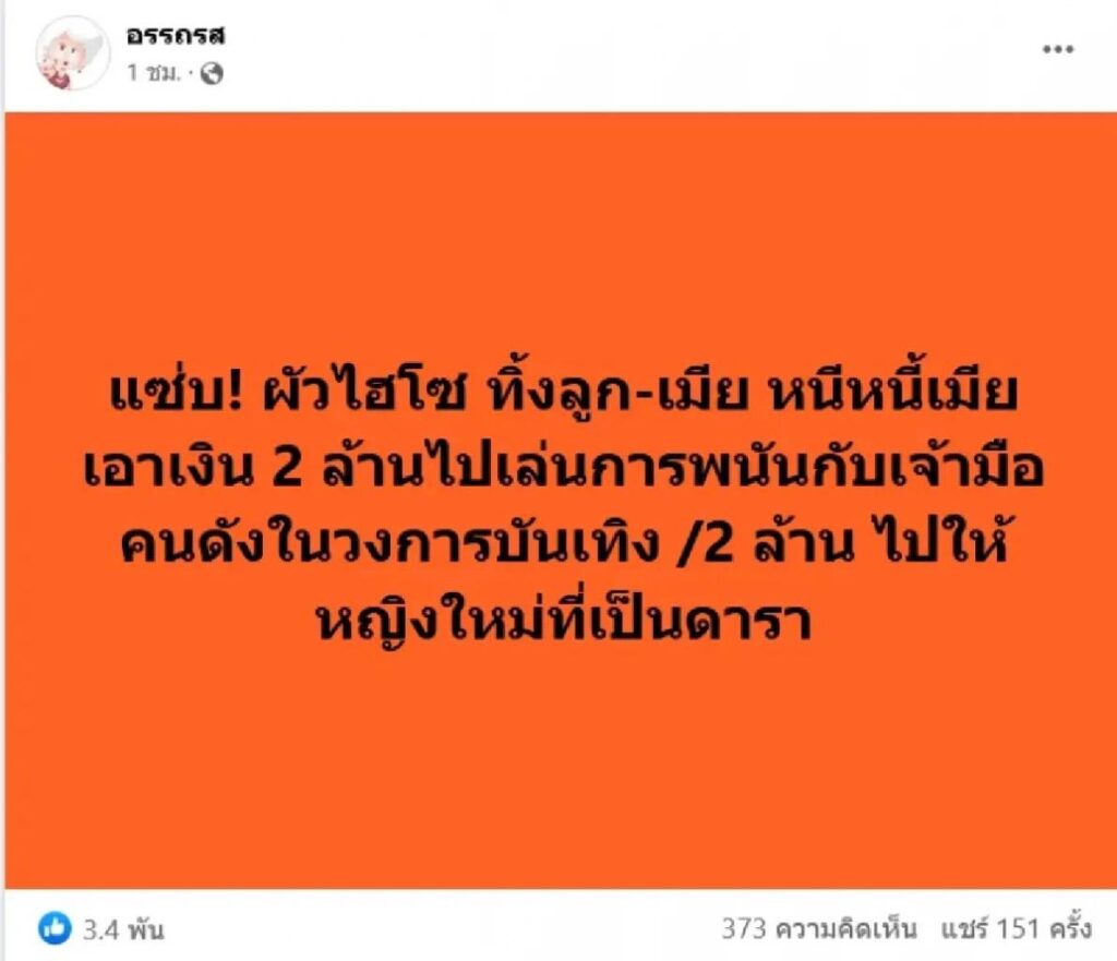 โดยเขียนข้อความ” แซ่บ ผัวไฮโซ ทิ้งลูก-เมีย หนีหนี้เมียเอาเงิน 2ล้าน ไปเล่นการพนันกับเจ้ามือคนดังในวงการบันเทิง / 2ล้าน ไปให้หญิงใหม่ที่เป็นดารา