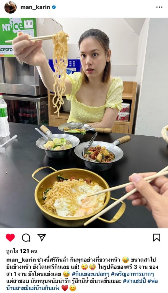 อย่างล่าสุดของ แมน ได้โพสต์ภาพแซวศรีภรรยา เกล แบบหวานฉ่ำ !! ว่าช่วงนี้ภรรยาเจริญอาหารมีน้ำมีนวลขึ้นเยอะน่ารักขึ้นแยะโดนใจสาสุดๆ@man_karin ช่วงนี้ศรีกินฉ่ำ กินทุกอย่างที่ขวางหน้า 😅 ขนาดสาไปยืนข้างหน้า ยังโดนศรีกินเลย แฮ่! 😜🤪 ในรูปคือของศรี 3 จาน ของสา 1 จาน ยังโดนแย่งเลย 😅 #กินเยอะแปลกๆ #เจริญอาหารมากๆ แต่สาชอบ มันหนุบหนับน่ารัก รู้สึกมีน้ำมีนวลขึ้นเยอะ #สาแฮปปี้ #พ่อบ้านสายมีแม่บ้านกินเก่ง ♥️😊งานนี้ทำเอาแฟนๆอดสงสัยไม่ได้ในความสวยออร่าจับของ เกล ได้คอมเมนต์แซวมาเบาๆมาแบบนี้ เพี้ยงขอให้เป็นจริงอย่างที่fcอย่างเราคิดด้วยเทอญ , มีเด็กคนไหนจะได้เป็นพี่หรือเปล่า