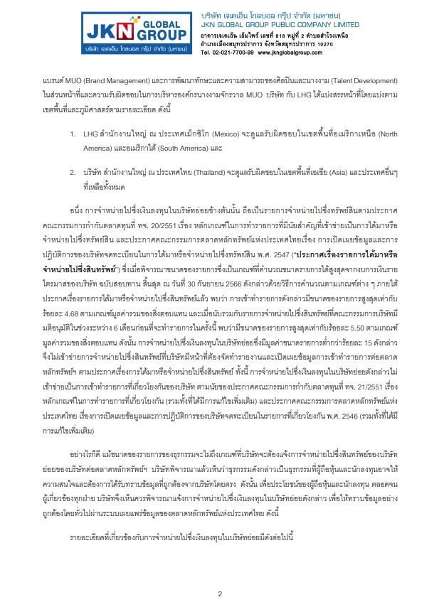 ล่าสุดทางด้าน”บริษัท เจเคเอ็น โกลบอล กรุ๊ป”ได้ออกมาแถลงการณ์ทำนองว่า “บริษัท เจเคเอ็น โกลบอล กรุ๊ป จำกัด (มหาชน) ขอแจ้งตลาดหลักทรัพย์แห่งประเทศไทยว่า ที่ประชุม คณะกรรมการบริษัทครั้งที่ 2/2567 มีมติรับทราบว่า JKN Global Content ซึ่งเป็นบริษัทย่อยที่บริษัทถือหุ้นร้อยละ 100 ของหุ้นทั้งหมด ได้ขายหุ้นสามัญ JKN Legacy บริษัทย่อยที่ดำเนินธุรกิจในองค์กรนางงามจักรวาล และครอบครองลิขสิทธิ์นางงามจักรวาล ให้แก่ Legacy Holding Group USA Inc จำนวน 500 หุ้น มูลค่าหุ้นละ 0.0001 ดอลลาร์สหรัฐ คิดเป็นร้อยละ 50 ของหุ้นทั้งหมดใน JKN Legacy มีราคาเท่ากับ 16,000,000 ดอลลาร์ หรือ 581,920,000 บาท