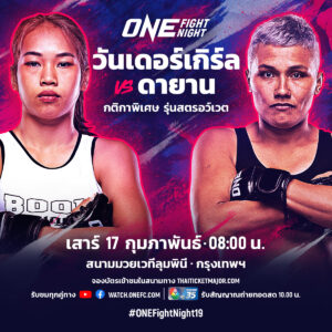 ศึก ONE Fight Night 19 กำหนดจัดขึ้นในวันเสาร์ที่ 17 ก.พ.นี้ ถ่ายทอดสดจากสนามมวยเวทีลุมพินี ในช่วงไพรม์ไทม์อเมริกาซึ่งตรงกับ 08.00 น. ตามเวลาไทย โดยมีคู่เอกเป็นการชิงแชมป์โลก ONE มวยไทย รุ่นแบนตัมเวต (135 – 145 ป.) ระหว่าง “โจนาธาน แฮ็กเกอร์ตี” เจ้าบัลลังก์คนปัจจุบันและผู้ท้าชิงอันดับ 3 ของแรงกิง “ฟิลิปเป โลโบ” ร่วมด้วยนักกีฬาตัวแทนชาวไทย “เสมาเพชร แฟร์แท็กซ์” เปิดศึกภาคสอง “โมฮาเหม็ด ราบาห์” และ “ทองพูน พีเค.แสนชัย” กลับมาแก้ตัวพบ “ทีมูร์ ชูอิคอฟ” น้องใหม่จากคีร์กีซสถาน