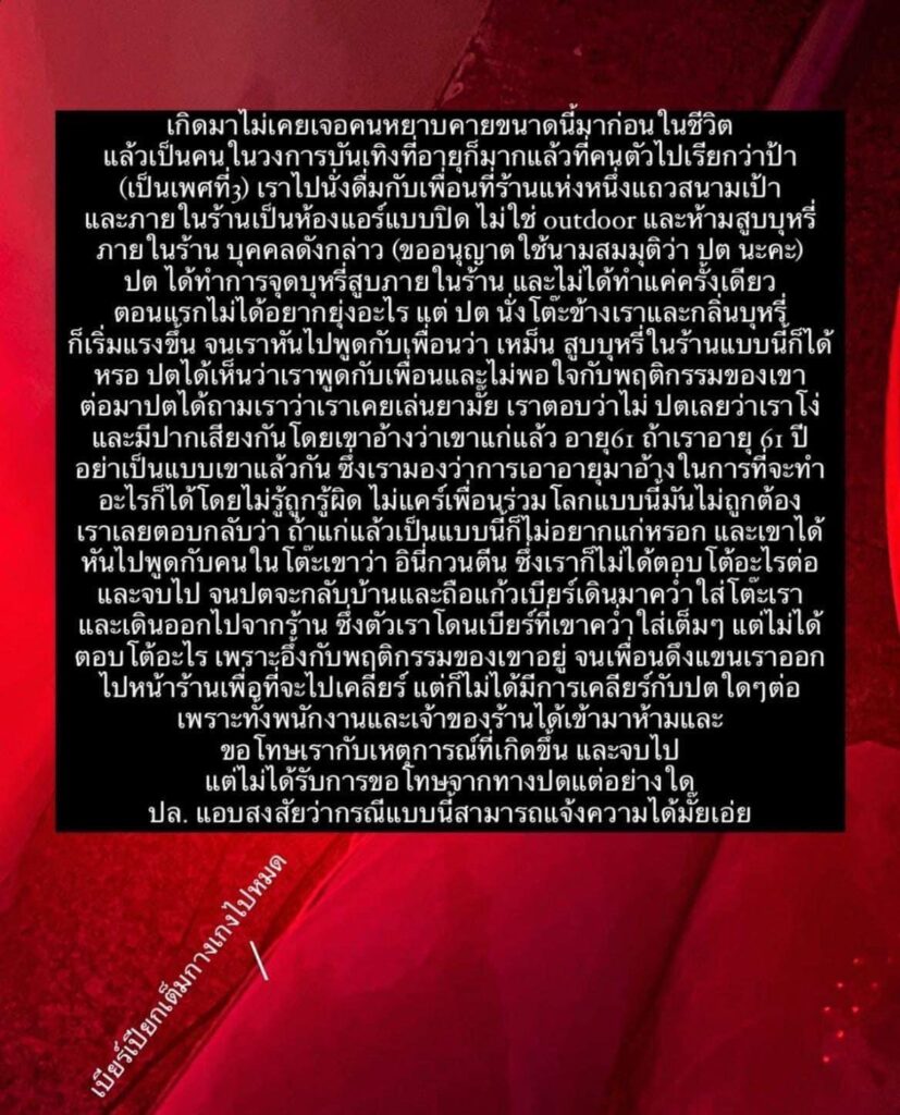 เป็นเรื่องที่หลายคนให้ความสนใจไม่น้อย หลังเพจดังออกมาโพสต์ข้อความของสาวรายหนึ่ง ที่อ้างว่ามีปากเสียงกับ ผู้ใหญ่ในวงการ อักษรย่อ “ปต.” ปมสูบบุหรี่ในร้าน ส่งกลิ่นและควันรบกวนจนทนไม่ไหว มีปากเสียงเถียงกัน หวิดมีเรื่อง