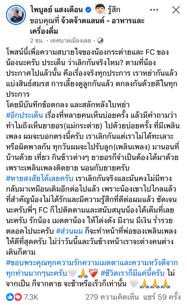 #หายสงสัยได้เลยครับ เราเลิกกันจริงและมันคงไม่มีทางกลับมาเหมือนเดิมอีกต่อไปแล้ว เพราะน้องเขาไปไกลแล้ว ที่สำคัญน้องไม่ได้รักและมีความรู้สึกที่ดีต่อผมแล้ว ชัดเจนนะครับพี่ๆ FC ก็ไปติดตามและสนับสนุนน้องได้เต็มที่เลยนะครับ รักน้อง เมตตาน้อง ให้โด่งดัง มีงาน มีเงิน ร่ำรวยตลอดไปนะครับ #ส่วนผม ก็จะทำหน้าที่พ่อของเพลินเพลงให้ดีที่สุดครับ ไม่ว่าวันนี้และวันข้างหน้าเราจะต่างคนต่างเดินก็ตาม