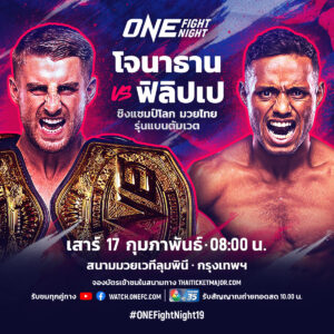 โจนาธาน แฮ็กเกอร์ตี แชมป์โลก ONE มวยไทย และคิกบ็อกซิ่ง รุ่นแบนตัมเวต (135-145 ป.) วัย 26 ปี จากเกาะอังกฤษ เตรียมลงทำหน้าที่ป้องกันบัลลังก์มวยไทย เป็นครั้งแรก พบกับ ฟิลิปเป โลโบ จอมบู๊พลังอึด วัย 30 ปี จากบราซิล ผู้ท้าชิงอันดับ 3 ของแรงกิงรุ่นนี้ ในศึก ONE Fight Night 19: โจนาธาน vs ฟิลิปเป ณ สนามมวยเวทีลุมพินี รามอินทรา ถ่ายทอดสดในช่วงไพรม์ไทม์อเมริกา ซึ่งตรงกับช่วงเช้าเวลา 08.00 น. ของวันเสาร์ที่ 17 ก.พ.นี้