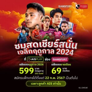 SIAMSPORT จับมือ AIS ส่งตรงสุดยอดความมันจากขอบสนามถึงหน้าจอให้แฟนบอลชมสด และส่งกำลังใจเชียร์แข้งไทย บนเวที J.LEAGUE ทั้ง 152 แมตช์ พร้อมไฮไลต์ และรีรัน ตลอดฤดูกาล 2024 ได้แล้วบน AIS PLAY ช่อง SIAMSPORT เริ่มนัดแรก 23 กุมภาพันธ์ 2567 เฉพาะลูกค้า AIS เท่านั้น