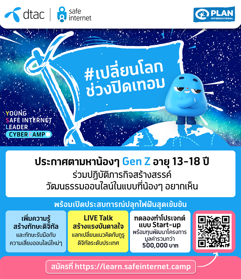 ดีแทค ขอชวนน้องๆ อายุ 13-18 ปี มา #เปลี่ยนโลกช่วงปิดเทอม สร้างเครือข่าย และแสดงพลังลงมือสร้างการเปลี่ยนแปลงด้วยการต่อยอดความรู้ ส่งเสริม “วัฒนธรรมออนไลน์สร้างสรรค์” มีความรับผิดชอบ เพื่อพื้นที่ออนไลน์ที่ปลอดภัยสำหรับทุกคน สมัครได้แล้ววันนี้ที่ https://learn.safeinternet.camp
