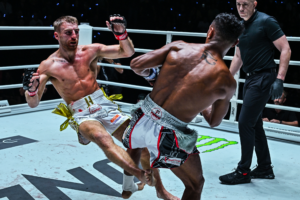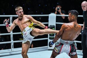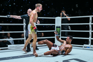 คู่เอก โจนาธาน แฮ็กเกอร์ตี ชนะทีเคโอ ฟิลิปเป โลโบ นาทีที่ 0:45 ของยกที่ 3 (ชิงแชมป์โลก ONE มวยไทย รุ่นแบนตัมเวต 135 – 145 ป.)