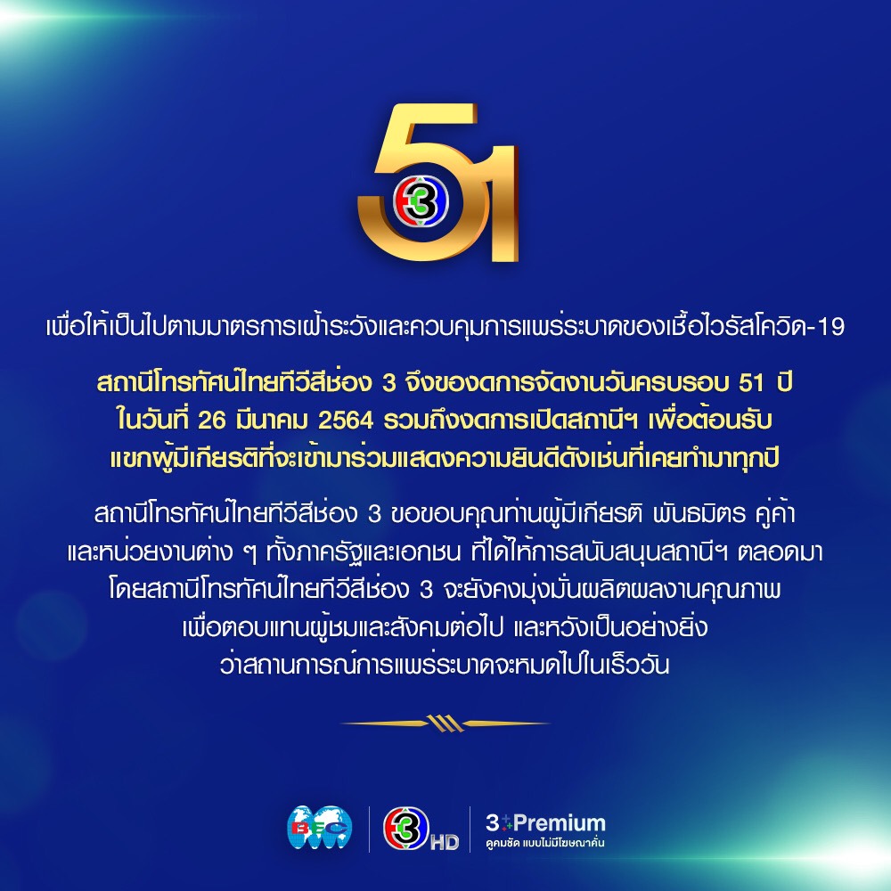 ช่อง 3 ขอแจ้งงดการจัดงานเนื่องในโอกาสครบรอบ 51 ปี และงดการเปิดเข้าร่วมแสดงความยินดีเหมือนเช่นทุกปี ทั้งนี้เพื่อให้เป็นไปตามมาตรการเฝ้าระวังและควบคุมการแพร่ระบาดของไวรัสโควิด-19 ที่สถานการณ์ยังคงมีความไม่แน่นอน