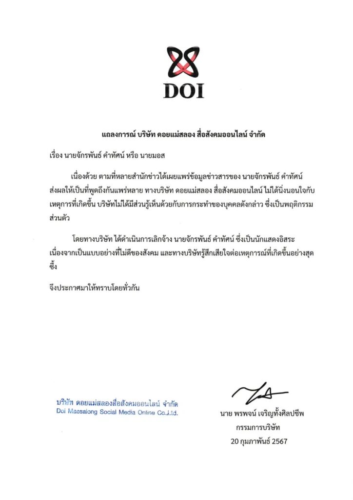 ล่าสุดทางด้านต้นสังกัด”ดอยแม่สลอง”ได้ออกมาลงดาบ ประกาศปลดนักแสดงดังกล่าว โดยเขียนข้อความว่า“เนื่องด้วย ตามที่หลายสำนักข่าวได้เผยแพร่ข้อมูลข่าวสารของ นายจักรพันธ์ คำทัศน์ ส่งผลให้เป็นที่พูดถึงกันแพร่หลาย ทางบริษัท ดอยแม่สลอง สื่อสังคมออนไลน์ ไม่ได้นิ่งนอนใจกับเหตุการที่เกิดขึ้น บริษัทไม่ได้มีส่วนรู้เห็นด้วยกับการกระทำของบุคคลดังกล่าว ซึ่งเป็นพฤติกรรมส่วนตัว