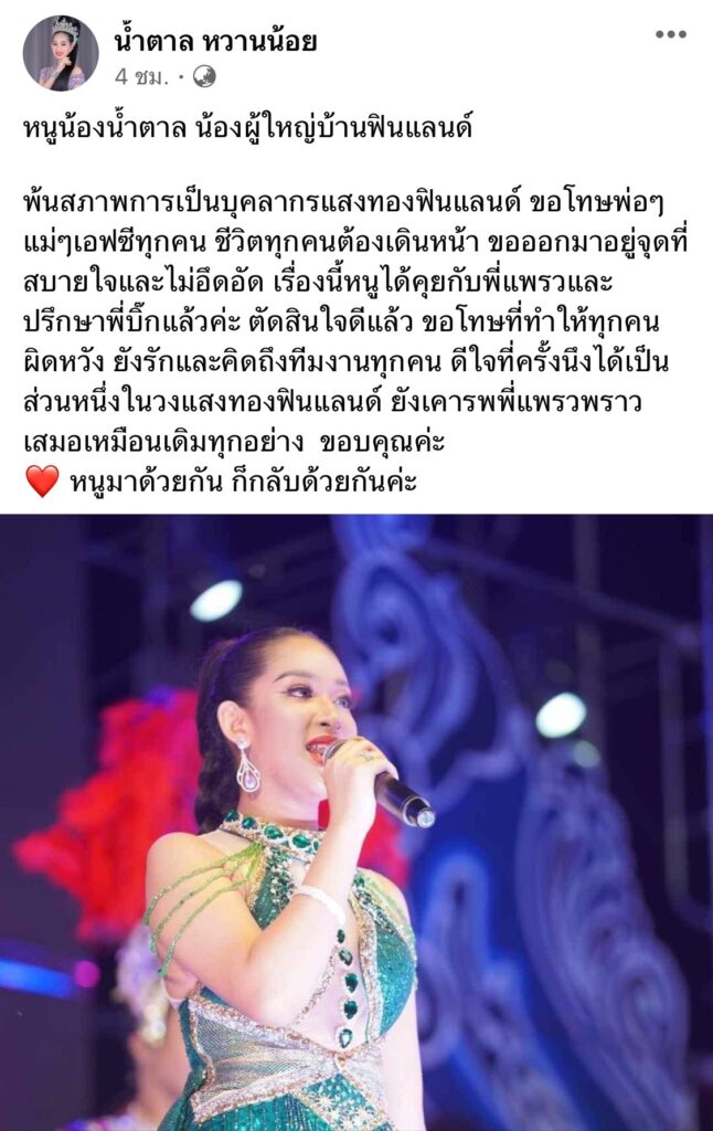 “หนูน้องน้ำตาล น้องผู้ใหญ่บ้านฟินแลนด์…พ้นสภาพการเป็นบุคลากรแสงทองฟินแลนด์ ขอโทษพ่อๆแม่ๆเอฟซีทุกคน ชีวิตทุกคนต้องเดินหน้า ขอออกมาอยู่จุดที่สบายใจและไม่อึดอัด เรื่องนี้หนูได้คุยกับพี่แพรวและปรึกษาพี่บิ๊กแล้วค่ะ ตัดสินใจดีแล้ว ขอโทษที่ทำให้ทุกคนผิดหวัง ยังรักและคิดถึงทีมงานทุกคน ดีใจที่ครั้งนึงได้เป็นส่วนหนึ่งในวงแสงทองฟินแลนด์ ยังเคารพพี่แพรวพราวเสมอเหมือนเดิมทุกอย่าง ขอบคุณค่ะ ❤️ หนูมาด้วยกัน ก็กลับด้วยกันค่ะ”