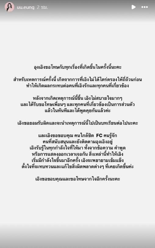 “อุงเอิงขอโทษกับทุกเรื่องที่เกิดขึ้นในครั้งนี้นะคะ สำหรับเหตุการณ์ครั้งนี้ เกิดจากการที่เอิงไม่ได้ไตร่ตรองให้ถี่ถ้วนก่อน ทำให้เกิดผลกระทบต่อคนที่เอิงรักและทุกคนที่เกี่ยวข้อง หลังจากเกิดเหตุการณ์นี้ขึ้น เอิงไม่สบายใจมาก ๆ และได้รีบขอโทษเพื่อน ๆ และทุกคนที่เกี่ยวข้องเป็นการส่วนตัวแล้วในทันที และได้พูดคุยกันแล้วค่ะ เอิงขอยอมรับผิดและจะนำเหตุการณ์นี้ไปเป็นบทเรียนต่อไปนะคะ และเอิงขอขอบคุณคนใกล้ชิด FC คนรู้จัก คนที่สนับสนุนและยังติดตามอุงเอิงอยู่ เอิงรับรู้ในทุกกำลังใจที่ให้มา ทั้งจากข้อความ คำพูด หรือการแสดงออกเวลาเจอกัน