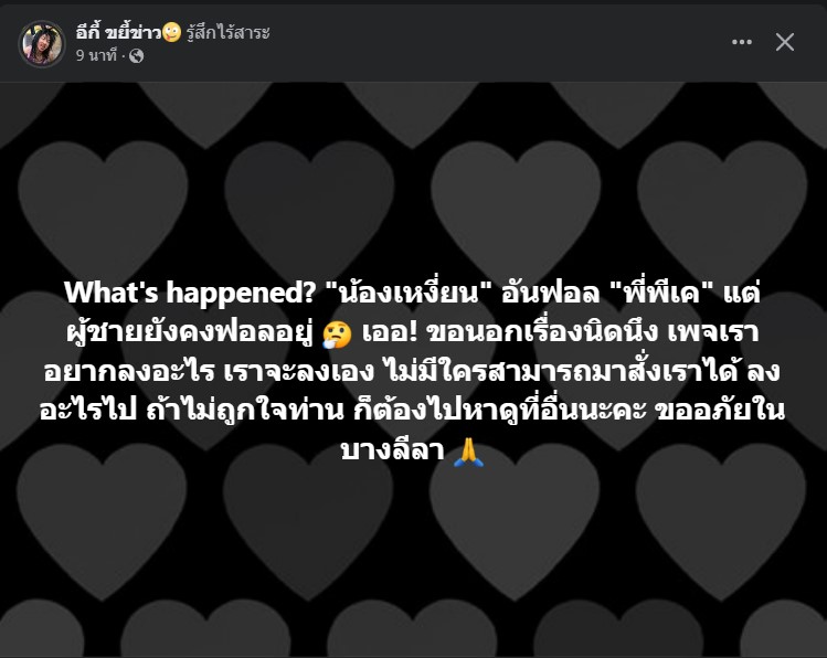 แต่ล่าสุดดแซ่บซู้ดปากอีก เมื่อเพจ อีกี้ขยี้ข่าว ออกบอกเม้าท์ต่อว่า “What’s happened? “น้องเหงี่ยน” อันฟอล “พี่พีเค” แต่ผู้ชายยังคงฟอลอยู่ 🤔 เออ! ขอนอกเรื่องนิดนึง เพจเราอยากลงอะไร เราจะลงเอง ไม่มีใครสามารถมาสั่งเราได้ ลงอะไรไป ถ้าไม่ถูกใจท่าน ก็ต้องไปหาดูที่อื่นนะคะ ขออภัยในบางลีลา 🙏”