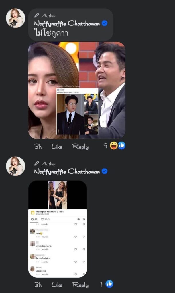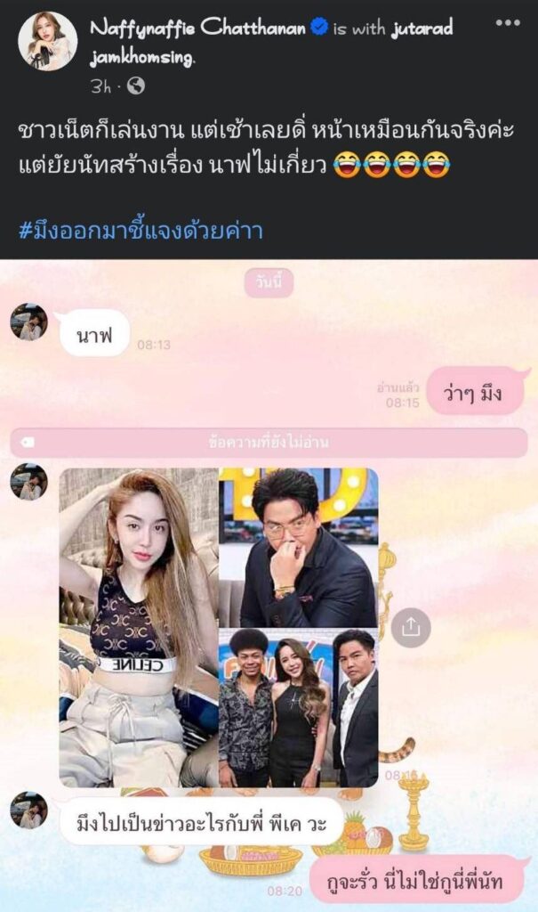โดยทางด้าน”นาฟ”ได้ออกมาเคลียร์ โพสต์ภาพแซตที่คนสนิททักไลน์ พร้อมแปะภาพสาว”นัฐ”กับ”พีเค”ทักถามว่า”มึงไปเป็นข่าวอะไรกับพี่พีเคว่ะ ซึ่งสาวนาฟก็ตอบกลับว่า “กูจะรั่ว นี่ไม่ใช่กู นี่คือพี่นัท” พร้อมแคปชั่นว่า” ชาวเน็ตก็เล่นงาน แต่เช้าเลยดิ่ หน้าเหมือนกันจริงค่ะแต่ยัยนัทสร้างเรื่อง นาฟไม่เกี่ยว #มึงออกมาชี้แจงด้วยค่าา” และยังคอมเมนต์ใต้คลิปว่า”ไม่ใช่กูค่า”