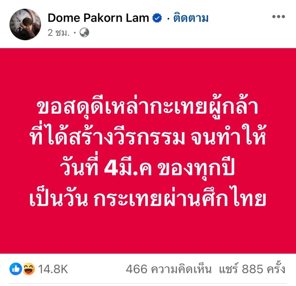 งานนี้เหล่าบรรดาคนดังในวงการบันเทิงหลายคนออกมาเคลื่อนไหวเกี่ยวกับเรื่องดังกล่าว เช่นเดียวกับหนุ่มหล่อขั้นเทพ “โดม ปกรณ์ ลัม” ที่ได้โพสต์ข้อความผ่านเฟซบุ๊กส่วนตัวว่า “ขอสดุดีเหล่ากะเทยผู้กล้า ที่ได้สร้างวีรกรรม จนทำให้วันที่ 4มี.ค ของทุกปี เป็นวัน กระเทยผ่านศึกไทย”