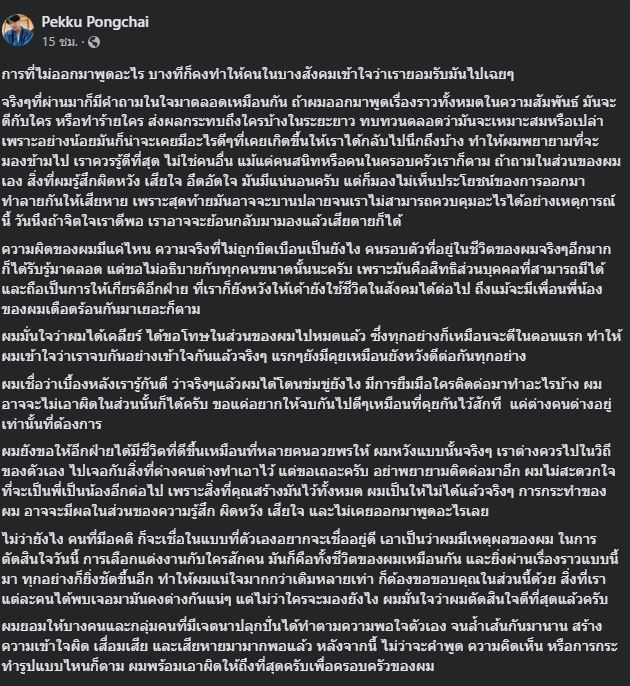 จนล่าสุด “เป๊กซ์” ได้ออกมาโพสต์ข้อความเผยปมเลิกรากับอดีตแฟนสาว เผยที่ผ่านมาไม่พูดเพราะไม่อยากให้ใครได้รับผลกระทบ และตัวเองรู้ดีที่สุดว่าเกิดอะไรขึ้นในความสัมพันธ์ ความผิดของตนมีแค่ไหน ความจริงที่ไม่ถูกบิดเบือนเป็นยังไง ตนได้ขอโทษในส่วนที่ผิดไปแล้ว และยังหวังให้อีกฝ่ายได้ใช้ชีวิตต่อไป  คนเบื้องหลังรู้ดีว่าที่ผ่านมาโดนข่มขู่ หรือแม้กระทั่งยืมมือใครมาทำอะไร ขอแค่อยากให้จบกันไปดีๆเหมือนที่คุยกันไว้สักที ต่างคนต่างอยู่เท่านั้นที่ต้องการ อย่าพยายามติดต่อมาอีก เพราะไม่สะดวกใจที่จะเป็นพี่น้องกันต่อไป