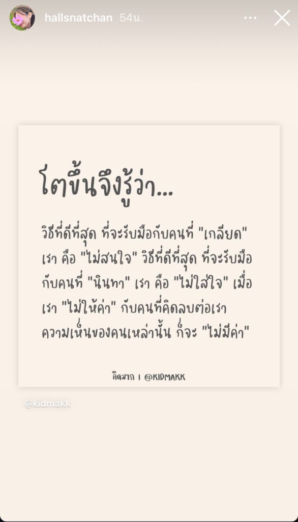 งานนี้พอเข้าไปส่องอินสตาแกรมของอดีตแฟนสาว ก็พบว่าเจ้าตัวได้มีการโพสต์คำคม ที่ระบุข้อความเอาไว้ว่า “โตขึ้นจึงรู้ว่า…วิธีที่ดีที่สุด ที่จะรับมือกับคนที่ “เกลียด” เรา คือ “ไม่สนใจ” วิธีที่ดีที่สุด ที่จะรับมือกับคนที่ “นินทา” เรา คือ “ไม่ใส่ใจ” เมื่อเรา “ไม่ให้ค่า” กับคนที่คิดลบต่อเราความเห็นของคนเหล่านั้น ก็จะ “ไม่มีค่า”  คิดมาก  @KIDMAKK”