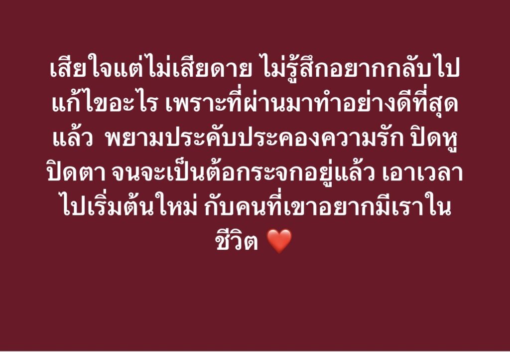 “เสียใจแต่ไม่เสียดาย ไม่รู้สึกอยากกลับไปแก้ไขอะไรแล้ว เพราะที่ผ่านมาทำดีที่สุดแล้ว พยายามประคับประคอง ความรักปิดหูปิดตา จนจะเป็นต้อกระจกอยู่แล้ว เอาเวลาไปเริ่มต้นใหม่ กับคนที่เขาอยากมีเราในชีวิต❤️”