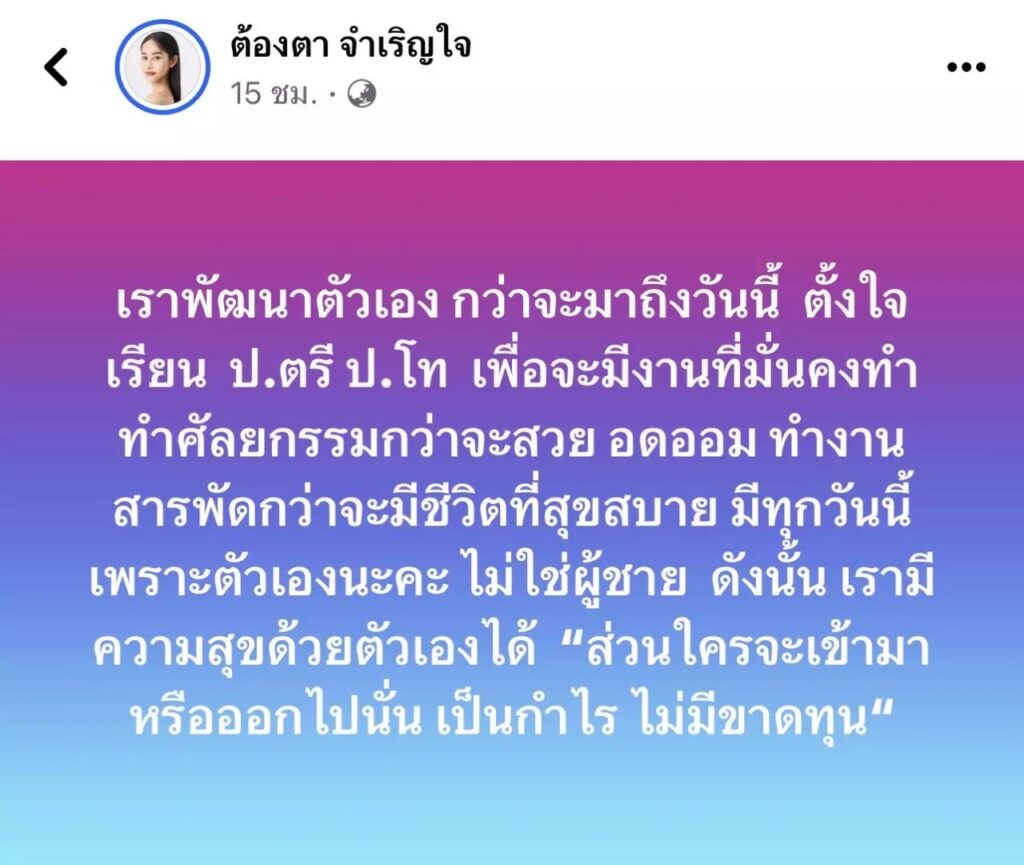 เรียกว่าทำเอาช็อควงการบันเทิงไม่น้อย สำหรับ “ครูต้องตา จำเจริญใจ” อดีตผู้เข้าประกวดมิสทิฟฟานี่ 2016 ที่ออกมาประกาศปิดฉากรักกับแฟนหนุ่มทหารเป็นที่เรียบร้อย โดยได้โพสต์ข้อความว่า “ปิดตำนานรัก 8 ปี ครูสาว กับ ทหาร ขอให้โชคดี กับเส้นทางของเธอ #คืนใจให้กัน ฉันขอคืนใจให้เธอ”