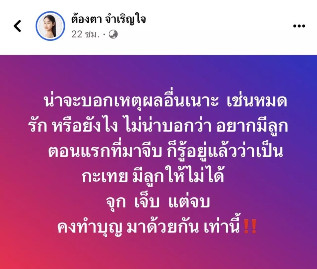 และต่อมาก็ได้ออกมาโพสต์รั่วๆว่า “น่าจะบอกเหตุผลอื่นเนาะ เช่นหมดรัก หรือยังไง ไม่น่าบอกว่า อยากมีลูก ตอนแรกที่มาจีบ ก็รู้อยู่แล้วว่าเป็นกะเทย มีลูกให้ไม่ได้ จุก เจ็บ แต่จบ คงทำบุญ มาด้วยกันเท่านี้ โลกใบนี้สอนให้เรารู้จักความไม่แน่นอน ผ่านความรักเพราะมันมองเห็นชัดเจนที่สุด พบรัก กับ จากลา เป็นแพคเกจที่มาพร้อมกัน”