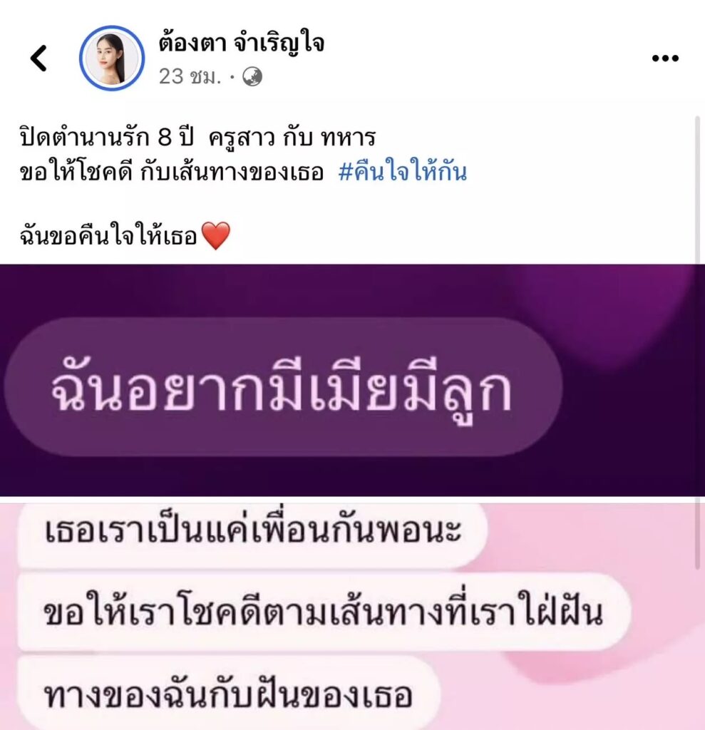 เลิกกันเพราะ! “ครูต้องตา”ขอมูฟหลังปิดฉากรักแฟนทหาร8ปี เพราะมีลูกให้ไม่ได้ ยอมรับเสียใจแต่ขอเดินต่อไป