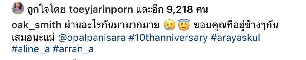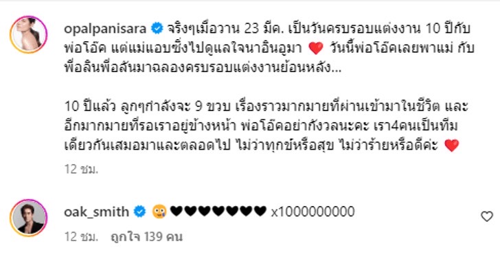 10 ปีแล้ว ลูกๆ กำลังจะ 9 ขวบ เรื่องราวมากมายที่ผ่านเข้ามาในชีวิต และอีกมากมายที่รอเราอยู่ข้างหน้า พ่อโอ๊ค อย่ากังวลนะคะ เรา 4 คนเป็นทีมเดียวกันเสมอมาและตลอดไป ไม่ว่าทุกข์หรือสุข ไม่ว่าร้ายหรือดีค่ะ”
