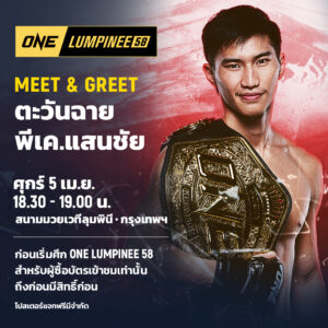 “ตะวันฉาย พีเค.แสนชัย” แชมป์โลก ONE มวยไทย รุ่นเฟเธอร์เวต (145-155 ป.) ขวัญใจมหาชน เตรียมพบปะแฟนมวยทุกคนแบบใกล้ชิด พร้อมแจกลายเซ็นด้วยตนเองที่สนามมวยเวทีลุมพินี (รามอินทรา) งานนี้สงวนสิทธิ์เฉพาะผู้ที่ซื้อบัตรเข้าชมศึก ONE ลุมพินี 58 เท่านั้น