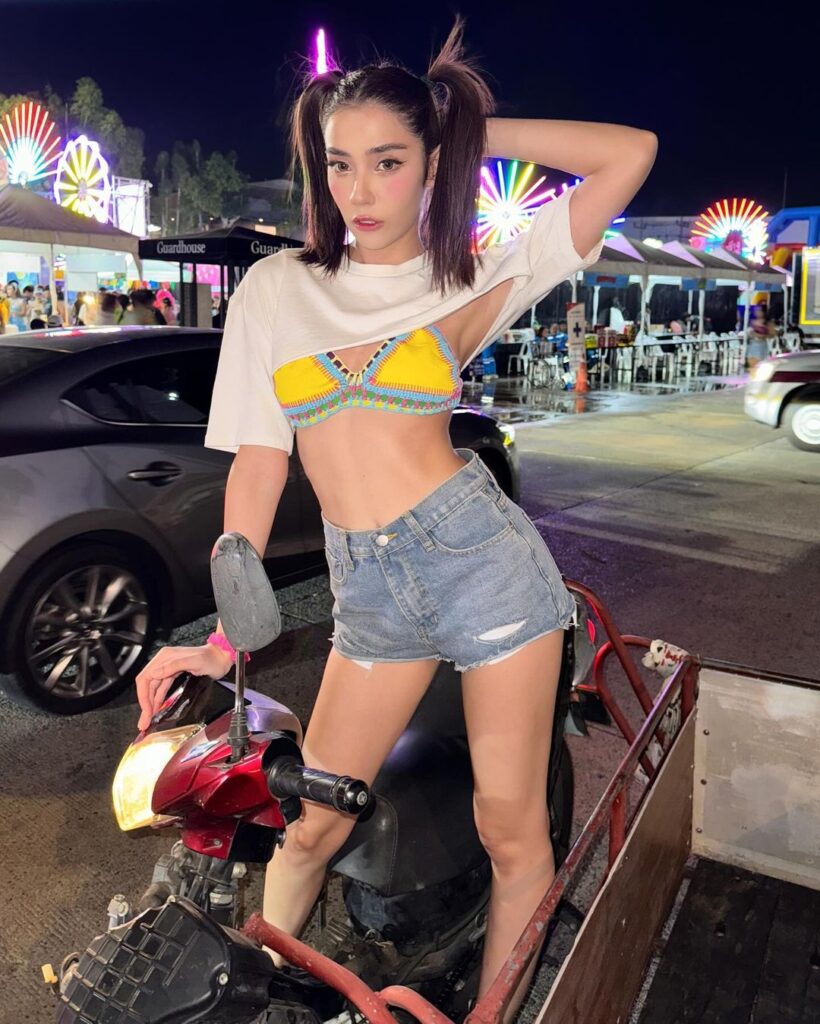 ส่วนทางด้าน “แอนนา เสืองามเอี่ยม” ก็ไม่ยอมแพ้ มาในลุคส์สายเดี่ยว ขาสั้น เข้าธีมพริตตี้กะบะซิ่งเวอร์