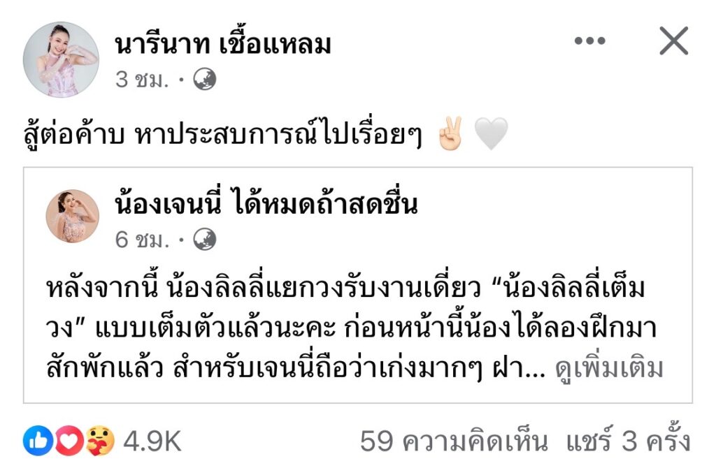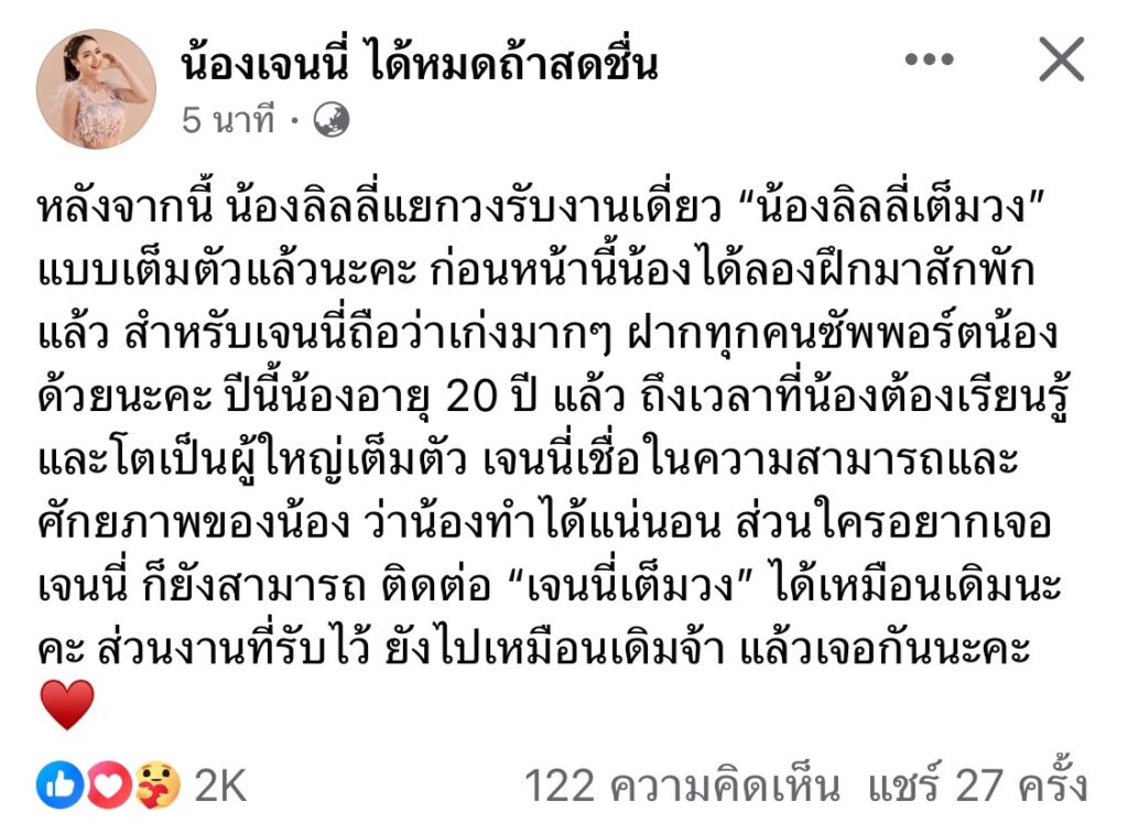 “หลังจากนี้ น้องลิลลี่แยกวงรับงานเดี่ยว “น้องลิลลี่เต็มวง” แบบเต็มตัวแล้วนะคะ ก่อนหน้านี้น้องได้ลองฝึกมาสักพักแล้ว สำหรับเจนนี่ถือว่าเก่งมากๆ ฝากทุกคนซัพพอร์ตน้องด้วยนะคะ ปีนี้น้องอายุ 20 ปี แล้ว ถึงเวลาที่น้องต้องเรียนรู้และโตเป็นผู้ใหญ่เต็มตัว เจนนี่เชื่อในความสามารถและศักยภาพของน้อง ว่าน้องทำได้แน่นอน ส่วนใครอยากเจอเจนนี่ ก็ยังสามารถ ติดต่อ “เจนนี่เต็มวง” ได้เหมือนเดิมนะคะ ส่วนงานที่รับไว้ ยังไปเหมือนเดิมจ้า แล้วเจอกันนะคะ ♥️”