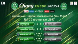 วันที่ 10 เมษายน 2567 การแข่งขันฟุตบอล ช้าง เอฟเอ คัพ ฤดูกาล 2023/24 รอบ 8 ทีมสุดท้าย ผลการแข่งขันมีดังนี้
