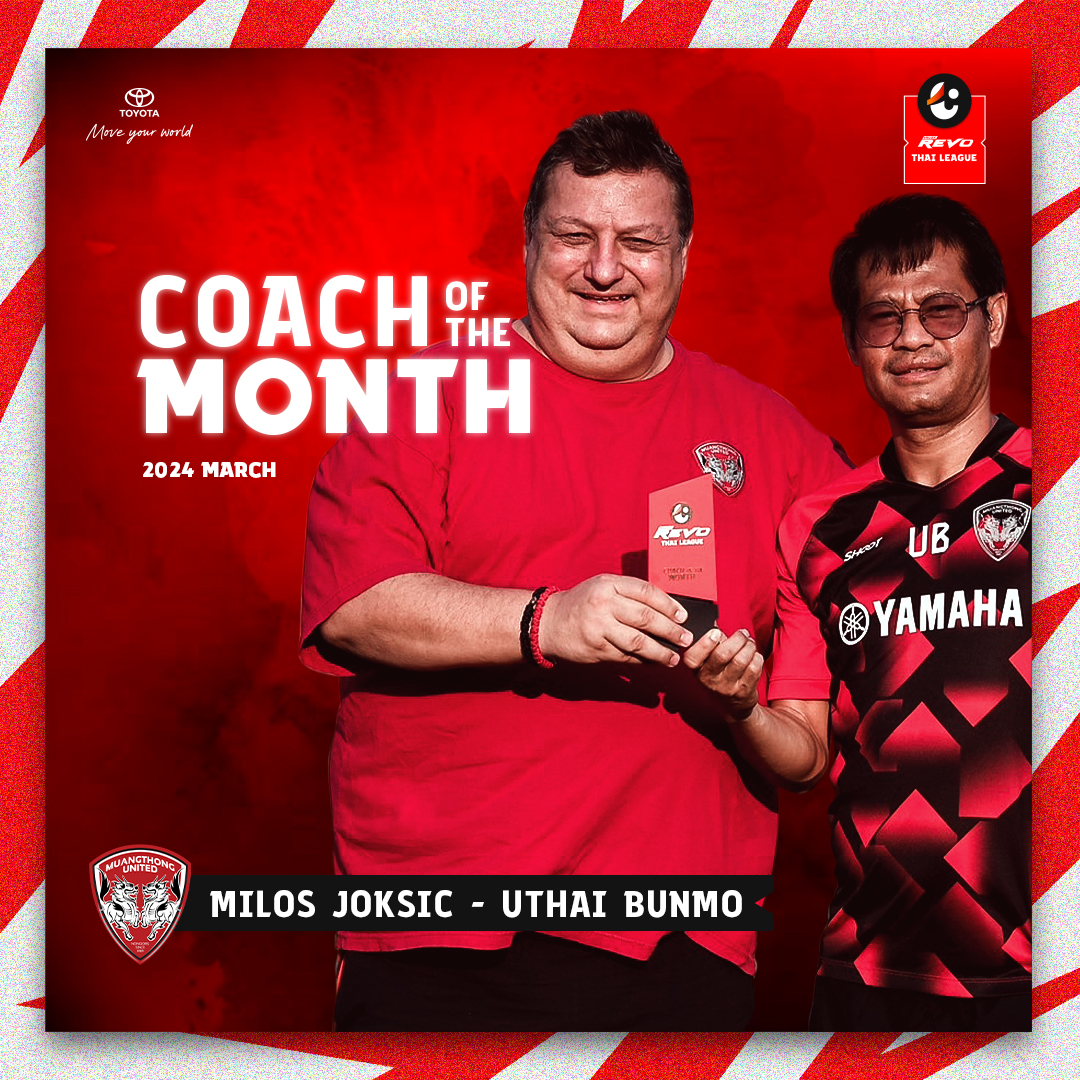 “กิเลนผยอง” เมืองทอง ยูไนเต็ด โชว์ฟอร์มได้อย่างร้อนแรงในช่วงเดือนมีนาคมที่ผ่านมากับการลงสนาม 3 นัดชนะรวดทั้ง 3 นัด ลูกทีมของ มิลอส โยซิช และ อุทัย บุญเหมาะ เอาชนะ พีที ประจวบ เอฟซี, ขอนแก่น ยูไนเต็ด และ โปลิศ เทโร เอฟซี รวมแล้วยิงไป 9 เสียแค่ 2 ประตูเท่านั้นทำให้ สองเฮดโค้ช คว้ารางวัลหัวหน้าผู้ฝึกสอนยอดเยี่ยมประจำเดือนมีนาคมไปครอง