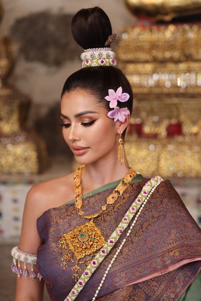 โดยชุดนี้มีความโดดเด่นด้วยเครื่องประดับทองคำแท้ ประดับด้วยเพชรและอัญมณีแท้ซึ่งเป็นงานทองคำสกุลช่างทองหลวง สกุลช่างเพชรบุรี รวมรวมฝีมือช่างชำนาญการมากฝีมือ ในการรังสรรค์ผลงานนี้ รวมน้ำหนักทองและอัญมณี มากกว่าหนึ่งร้อยบาท มูลค่ารวมผลงานถึง 15 ล้าน เพิ่มความงดงามอ่อนหวาน ด้วยงานกรองดอกไม้ที่เป็นงานฝีมืออีกแขนงของไทย ร้อยเรียงเป็น มาลัยครุย สวมประดับเป็นสังวาลย์ดอกไม้ และรัดต้นแขนดอกไม้สดเป็นพาหุรัด ทั้งยังใส่เกี้ยวรัดผมดอกไม้สดอย่างงดงาม