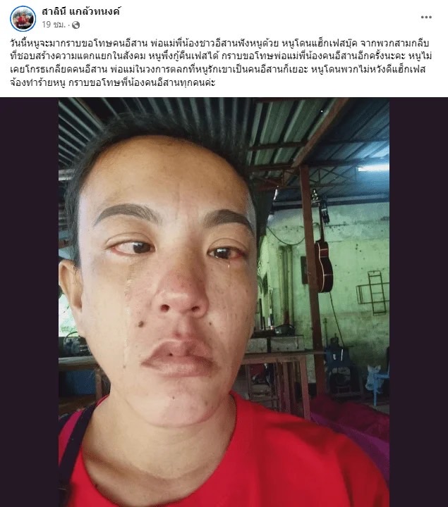 มีผู้หญิงทำการลวนลามผู้ชายคนหนึ่ง พร้อมเขียนแคปชั่นว่า “นี้คือพฤติกรรมของผู้หญิงอีสาน แล้วแบบนี้จะไม่ให้พี่พูดถูกถึงคนอีสานได้ยังไง พอพี่พูดความจริงก็รับไม่ได้กัน ปล่อยพวกอีสานพลัดถิ่นเข้ามาเล่นน้ำในสงกรานต์ทำไม หยุดยาวทำไมไม่กลับอีสานบ้านนอก ถ้านักท่องเที่ยวเห็นพฤติกรรมแบบนี้จะว่ายังไงพี่ ว่าพวกอีสานทำแต่เรื่อง เสื่อมเสียให้สังคมไทย” ซึ่งพอชาวเน็ตเห็นข้อความแบบนี้ก็ไม่พอใจเข้ามาคอมเมนต์ต่อว่ามองเป็นการเหยียดคนอีสาน