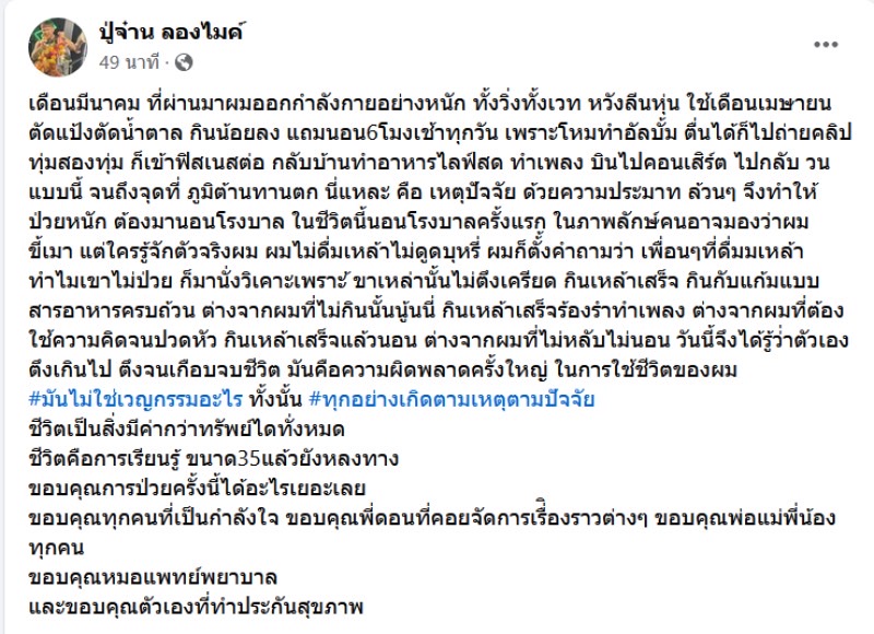 “ปู่จ๋าน ลองไมค์” ร่ายยาวขอบคุณอาการป่วย ชีวิตเป็นสิ่งมีค่ากว่าทรัพย์สิน
